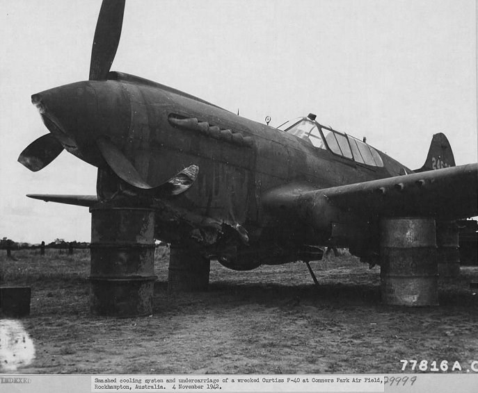Smashed cooling system and landing gear on a wrecked Curtiss P-40 Kittyhawk at Conners Park Airfield, Rockhampton 1942.