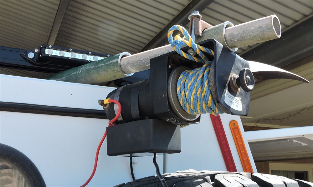 I have had a small 2,000lb winch sitting around in the shed for a few years and finally decided to make it work for me. I have four heavy duty Rhino bars on the canopy. I was concerned they may not be up to the task of taking the weight from underneath, but after doing this little job, I hung off the extension and it didn't flinch. Given that I weigh around 100kg, I figure it will have no worries with a 50kg tyre.