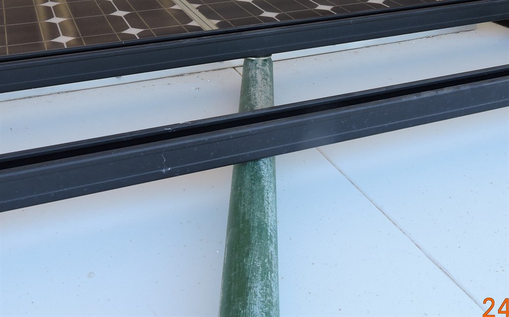 water pipe that was lying around and cut a piece 1,220mm long. I drilled a hole in one end and bolted it to the underside of a Rhino cross member, about 1,050mm in from the rear edge of the canopy. The bolt has a Nyloc nut and is tight, but not TOO tight......the steel pipe can pivot from one side to the other at the back. I moved the Rhino bars 2 & 3 closer together so that there would be some extra support for the pipe as it pushes upwards with the weight.