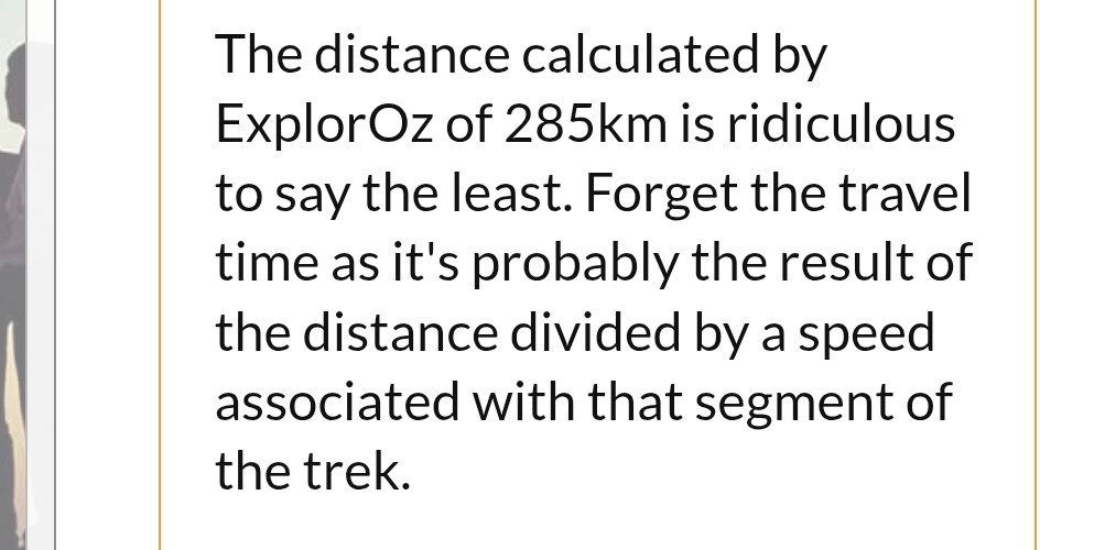 The distance calculated by ExplorOz of 285km is ridiculous to say the least. Forget the travel time as it's probably the result of the distance divided by a speed associated with that segment of the trek.