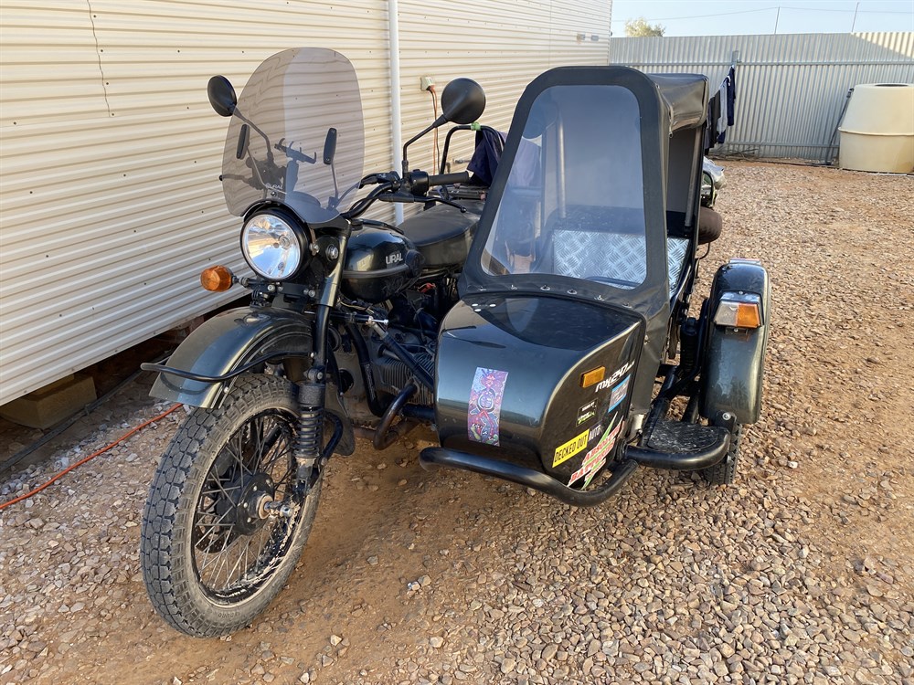 Perth on an Ural with sidecar, with his dog which travelled in the sidecar. He had come down the