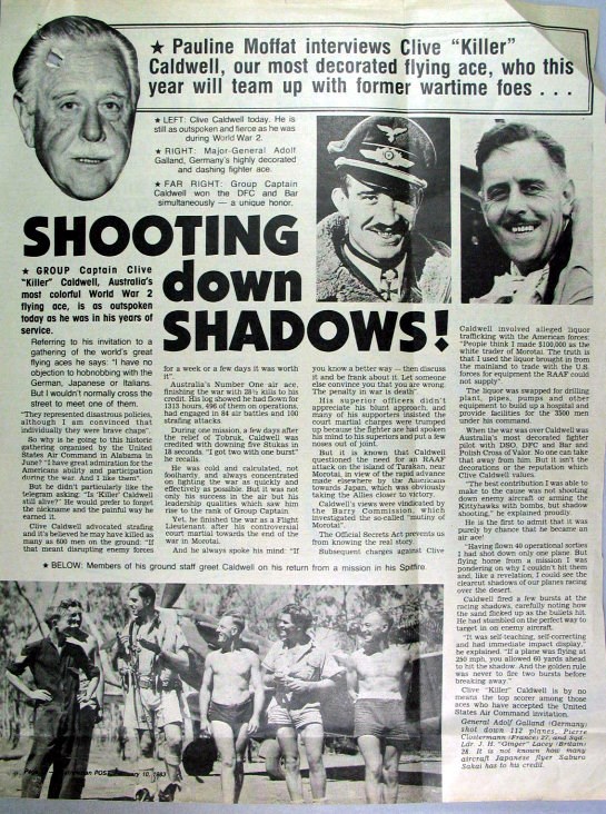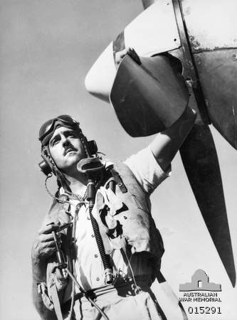 Group Captain Clive Robertson Caldwell DSO, DFC & Bar (28 July 1910 – 5 August 1994) was the leading Australian air ace of World War II. He is officially credited with shooting down 28.5 enemy aircraft in over 300 operational sorties. In addition to his official score, he has been ascribed six probables and 15 damaged. Caldwell flew Curtiss P-40 Tomahawks and Kittyhawks in the North African Campaign and Supermarine Spitfires in the South West Pacific Theatre. He was the highest-scoring P-40 pilot from any air force and the highest-scoring Allied pilot in North Africa. Caldwell also commanded a Royal Air Force (RAF) squadron and two different Royal Australian Air Force (RAAF) wings