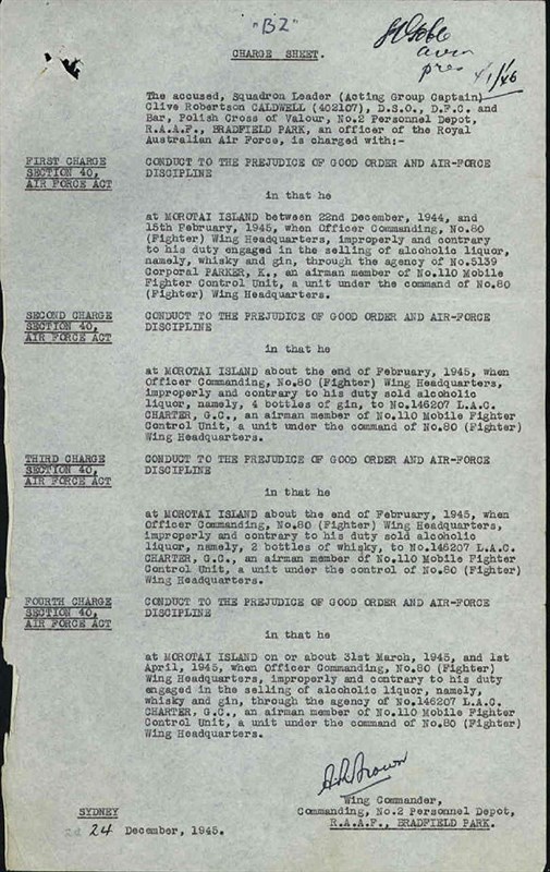 Prior to the "mutiny", Caldwell had been charged over his involvement in an alcohol racket on Morotai, where liquor was flown in by RAAF aircraft and then sold to the sizable U.S. forces contingent in the locality. He was court martialled in January 1946 and reduced to the rank of Flight Lieutenant. Caldwell left the service in February.