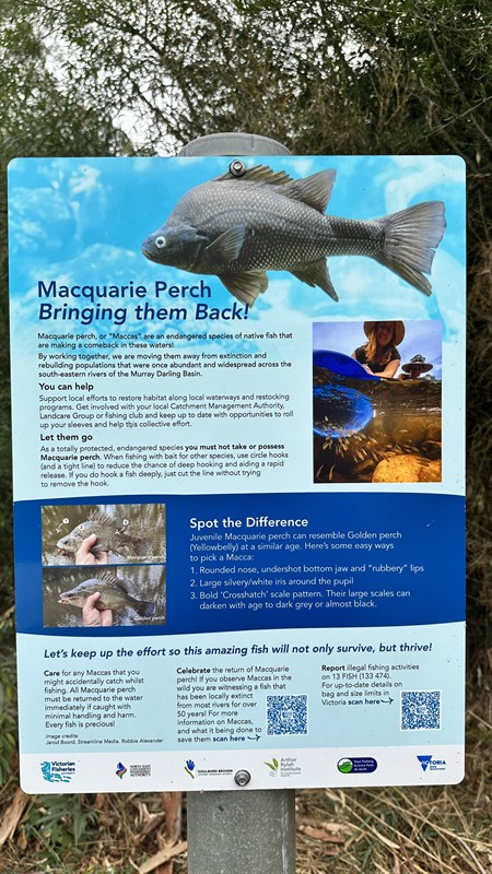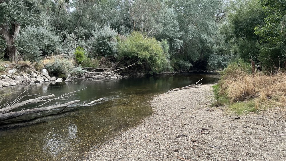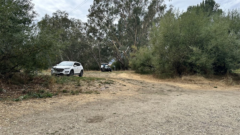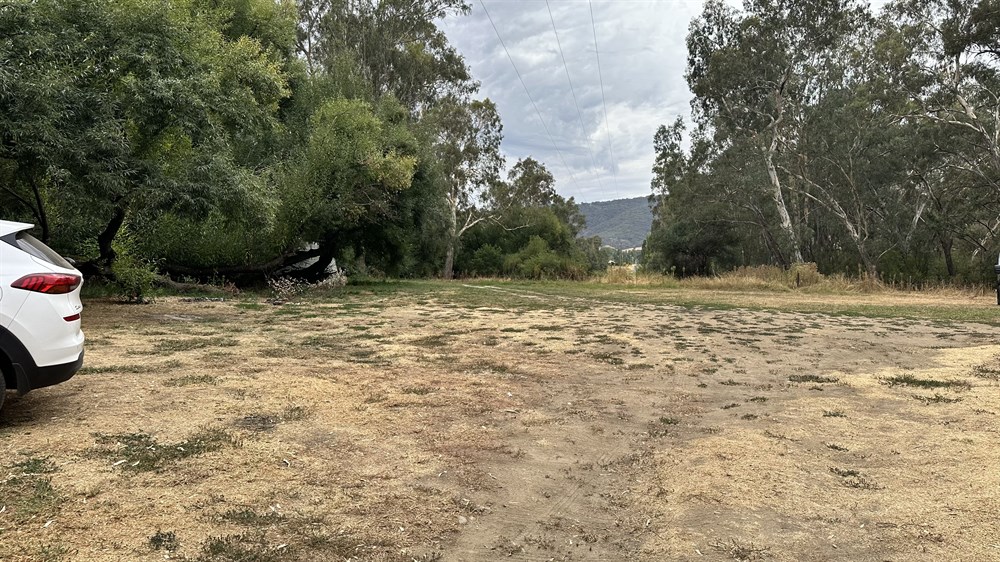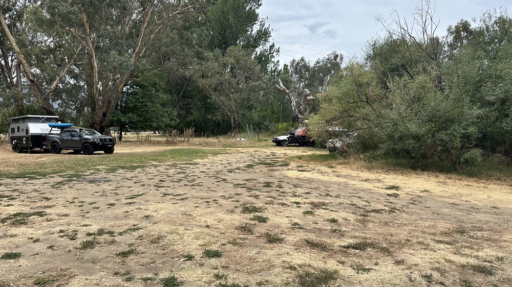 Free camp amid River gums on a grassy bank alongside the Kiewa River at Gundowering. Numerous sites, one table, no other facilities. Possibility of being boggy after large rainfalls