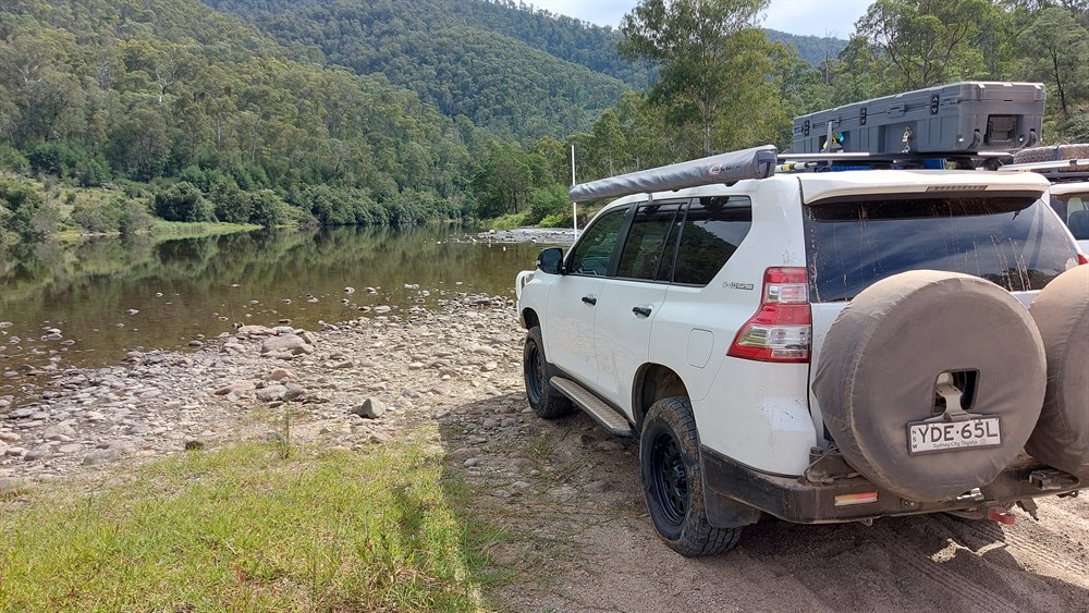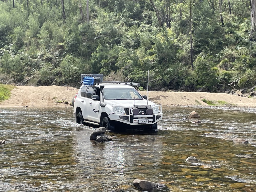 To cross the river from the west, enter the crossing, drive south on a relatively dry rocky track, turn into the river and pick up the track marked by rocks. Follow this downstream for about 50 metres, then turn east to exit the river. From the east the procedure is the reverse, with the route being self evident. Low