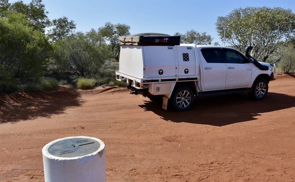 intersection of the Northern Territory and the states of South Australia and Western Australia is known as the Surveyor General's Corner. The corner consists of two actual markers separated by a distance of 127 metres. This creates a dogleg in the WA border. It is approximately seven km north east of Irrunytju (Wingellina) community. Both are on the land of Mr Eddy, however he has since passed away. It is highly unlikely for anyone these days to obtain permission to visit this spot and it was always only ever done via direct escort by one of the community elders. Please be aware that requesting access is not a guarantee that you'll be able to obtain permission or an escort. Your request may be ignored or refused.Arrangements (permits) are not easy to obtain.