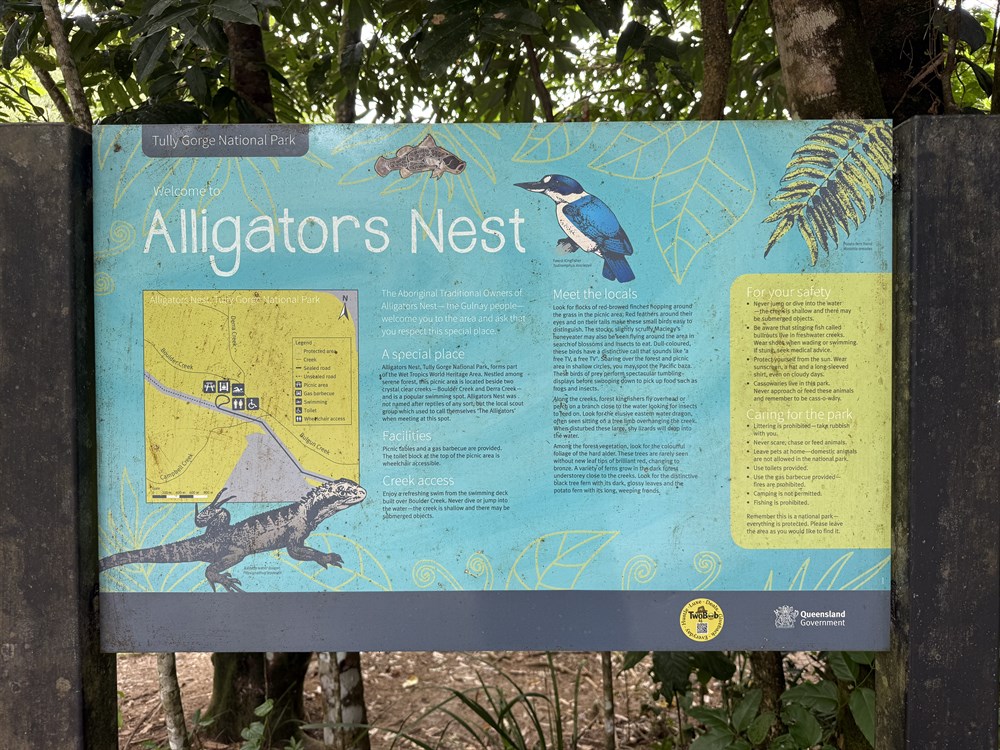 shelter shed. This popular swimming spot was not named after reptiles of any sort, but the local scout group The Alligators that used to meet there. Alligators Nest is a great spot for a refreshing swim. A large swimming platform provides easy access to the crystal clear waters of this rainforest stream