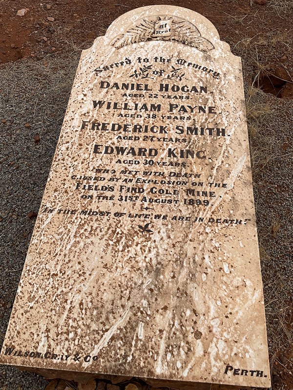 Yalgoo Goldfields at Fields Find was on the 31st Aug 1899. On this date there were four men working in the No 1 shaft of the Fields Find GM. They were Daniel HOGAN (22), William PAYNE (38), Frederick Robert SMITH (27), and Edward Era KING (30).The four men were working at the 60-meter level on the afternoon shift. Charges were set and lit and they retired 50 meters along the drive to a position considered safe. Those above ground heard the charges go off, followed shortly be an even louder and more severe blast. Though there was no direct evidence as to the actual cause of the explosion, it was shown at the following inquiry that dynamite used in the level was stared on the plat where the miners were accustomed to carrying naked lights and to smoke. It was also shown that it was not uncommon for detonators to be loose in the box containing the dynamite. On the morning of the accident, a 20-kilogram box of explosives plus a detonator was sent down below and stored in the usual place in contravention of the rules.All four men were killed instantly! The remains of the men were gathered into two coffins and buried one and a half kilometers from the