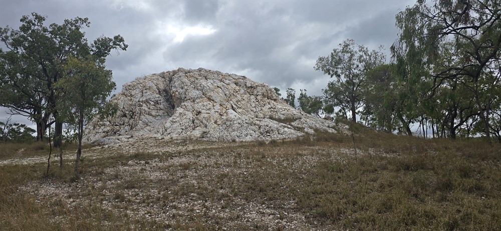 A milky quartz outcrop, locally known as White Blow, is a prominent feature of the