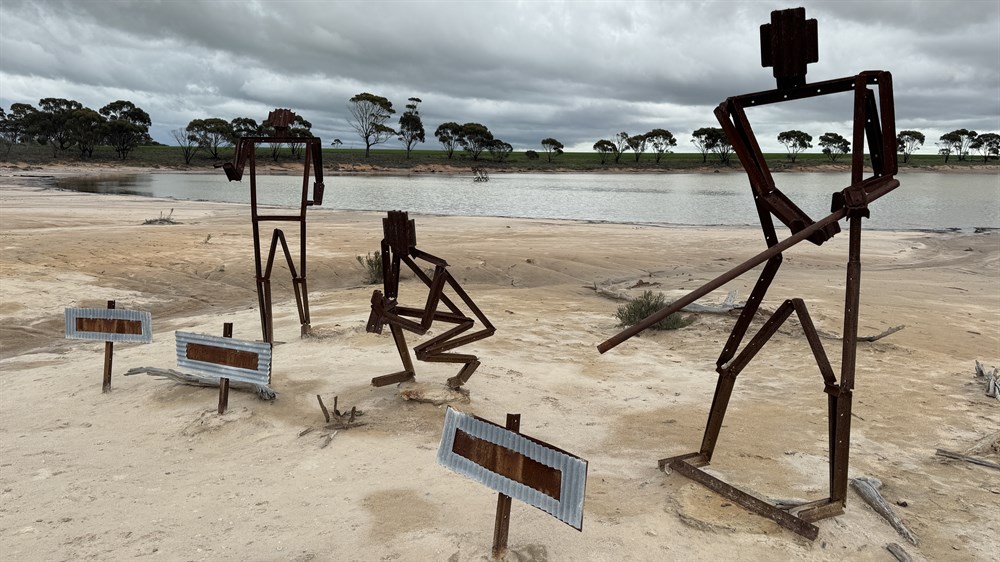 Corrigin-Kondinin Road, One of the sculptures which is titled "Waiting for Hay" was created by Kelly Browning, a local farmer, using star pickets. The images created are '