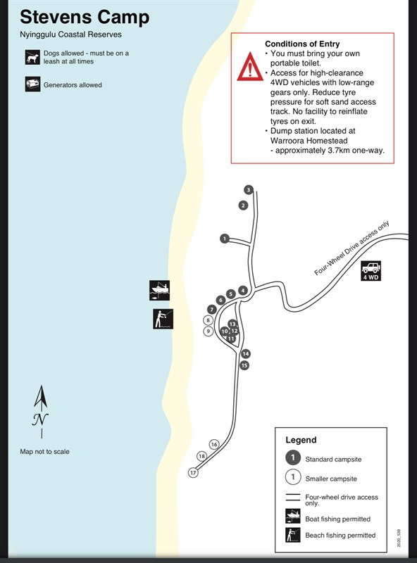 camping area is back behind the primary dune which offers some protection from the prevailing winds.As with all campsites are Warroora, you must book online the Parks website and byo