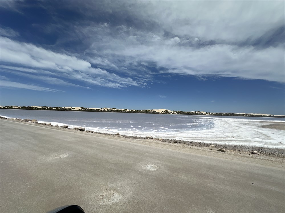 As you drive on a causeway across Lake McDonnell the high salt concentration gives the impression of a salmon-