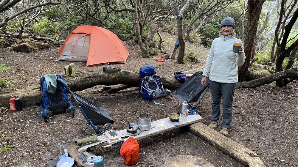 well-protected within coastal scrub and forest, which helps shield tents from the frequent high winds of the Southern Ocean.No wooden platforms. One long drop