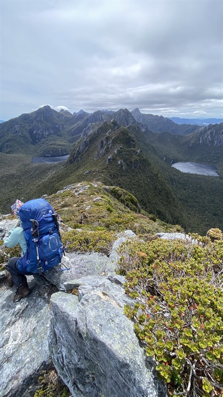Oberon campsites. This section is highly exposed to the wind. In the conditions shown (overcast and potentially gusty), hikers must move carefully along the rocky crest.