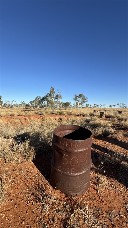 Well 50 (Jkarn) is just a gaping wide collapsed hole. There are some rotting timbers of the A-frame and fencing with a rusty bucket. The
