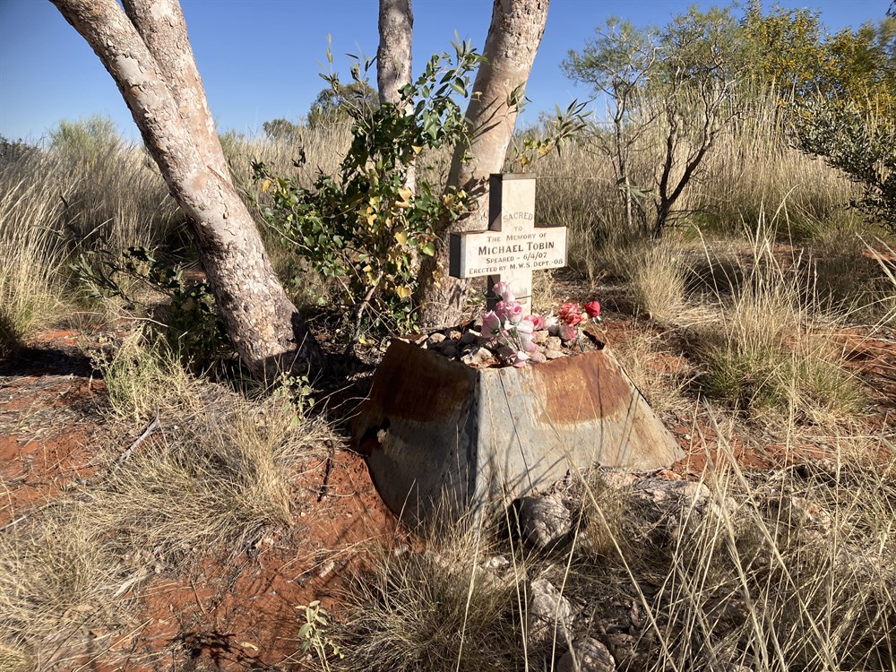 Canning Stock Route. His grave has a marble cross and clear embossed lettering with all the details of his death. A fence around the grave was rebuilt in 1987.