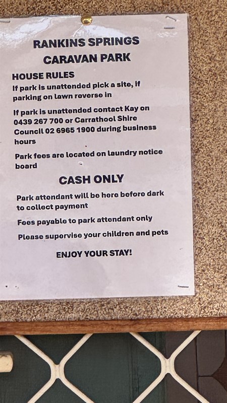 water and power. Tents, RVs, vans etc all types of rigs are permitted. Caretaker comes to collect cash payments.There is a pub across the road that serves meals. Current fees can be found on the Carrathool Shire Council website.