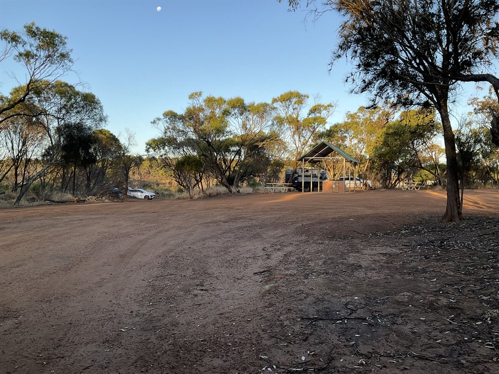 Rest Area on Northern side of road suitable for free overnight stays in large area for caravans, buses, campervans, camper trailers etc on dirt surface. Some secluded bays but main area is large and open with picnic tables, shelters, trees,