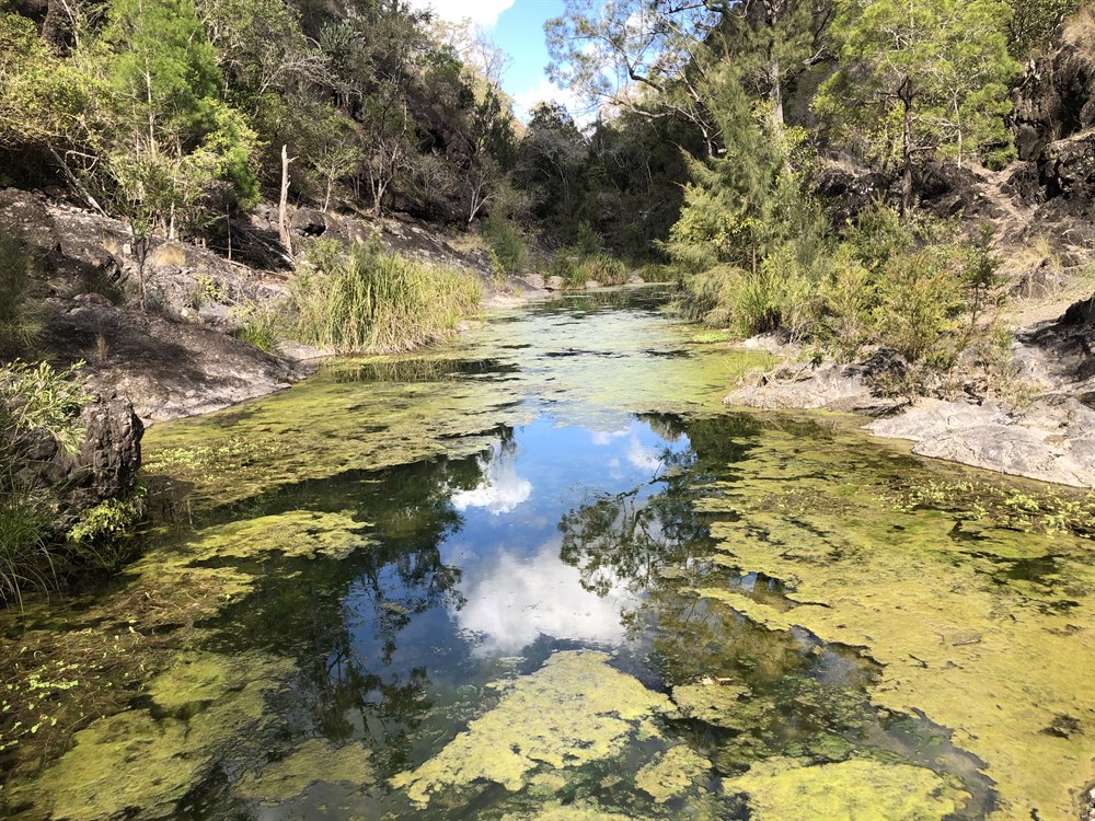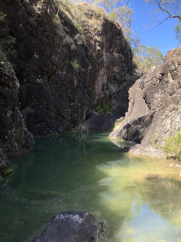 The falls are about 5 km from the Bunya Highway with the turn to the south at the hamlet of Kinbombi. The falls can also be approached from the south. Kinbombi Road joins on to the
