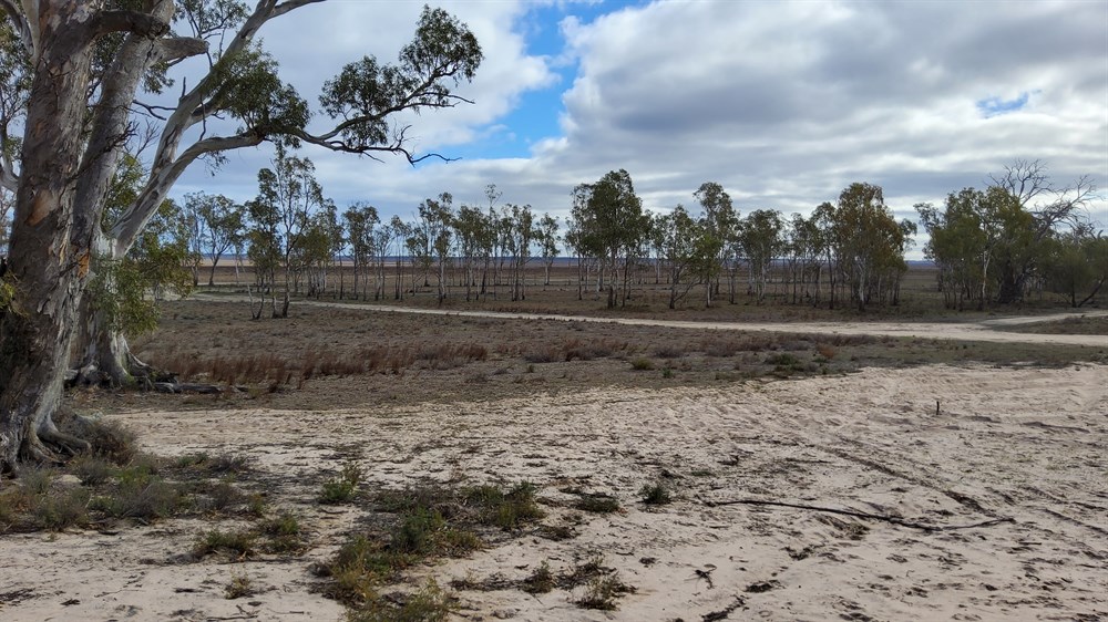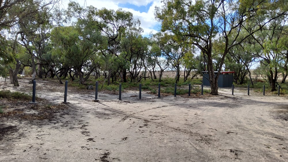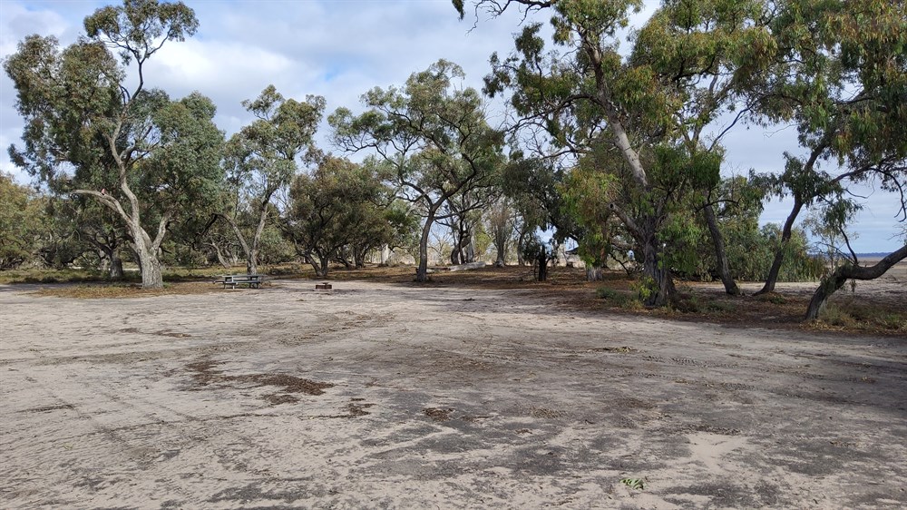 Camp site near lake. Located in a thin band of Red Gum and Black Box open woodland by the Lake shoreline. Two fireplaces and tables. Pit