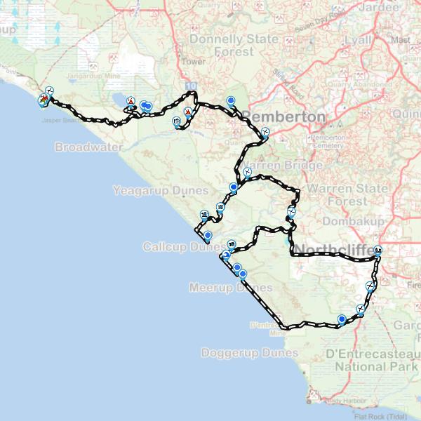 The trek can be divided into two separate sections: the centre and eastern section comprising the Yeagarup and Callcup dunes with magnificent karri roads accesses including the Carey Brook camping and Beedelup Falls areas; and the western section encompassing the very scenic Lake Jasper, Jasper Beach and Black Point.