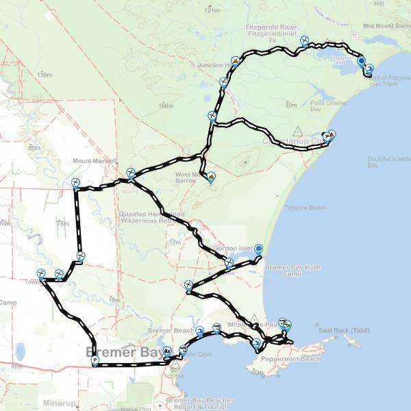 NOTE: the route shown here uses 4WD tracks which Parks & Wildlife may close due to dieback, or may be closed due to seasonal issues. In particular, the sandbar over the Inlet in